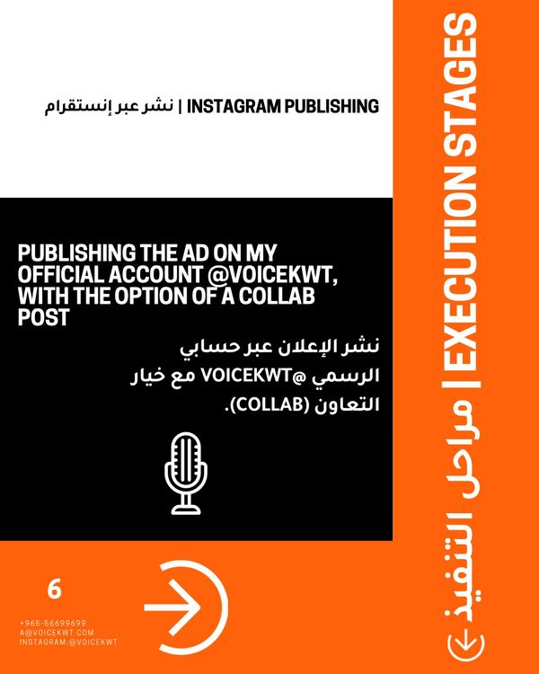 “نشر الإعلانات عبر حسابي الرسمي @voicekwt مع إمكانية التعاون (Collab Post) لزيادة الوصول والتفاعل. نساعدك في إبراز إعلانك أمام جمهور حقيقي وفعّال.”
