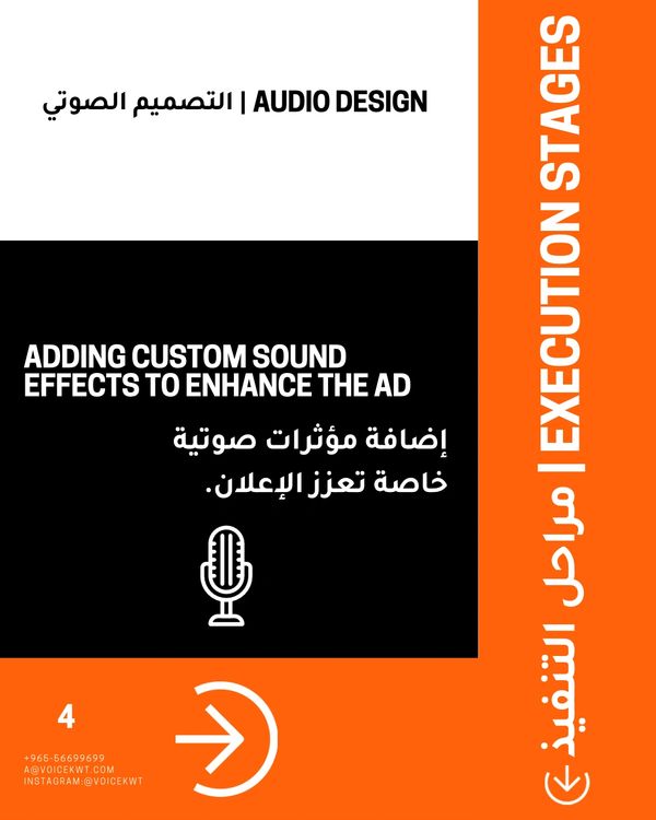 “إضافة مؤثرات صوتية خاصة لتعزيز الإعلانات وجعلها أكثر جاذبية. نهتم بكل تفصيلة صوتية لتوصيل الرسالة بشكل مؤثر واحترافي.”